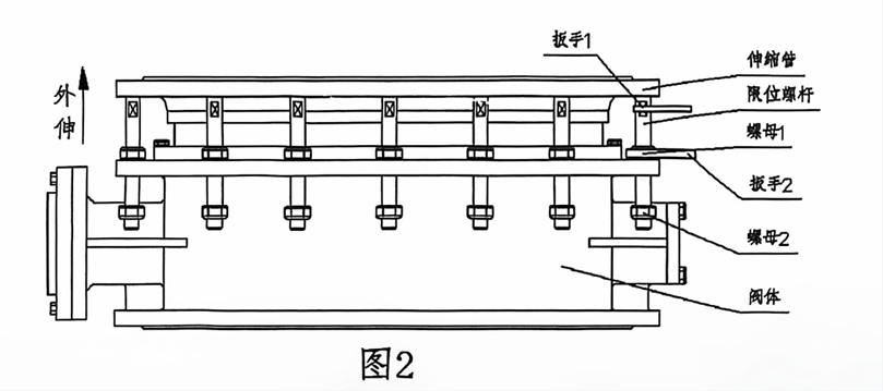 a.Use a wrench to secure the square head of the screw rod. Loosen Nut 1 and Nut 2. Adjust the length of the expansion butterfly structure according to on-site conditions. To extend the expansion tube: Secure the square head of the screw rod with a wrench, tighten Nut 1, and extend the expansion tube. See Figure 2. To retract the expansion tube: Secure the square head of the screw rod with a wrench and tighten Nut 2. This action retracts the expansion tube. See Figure 3. Then connect and secure the inspection door to the pipeline. However, the expansion tube must not exceed its rated expansion range (see nameplate).