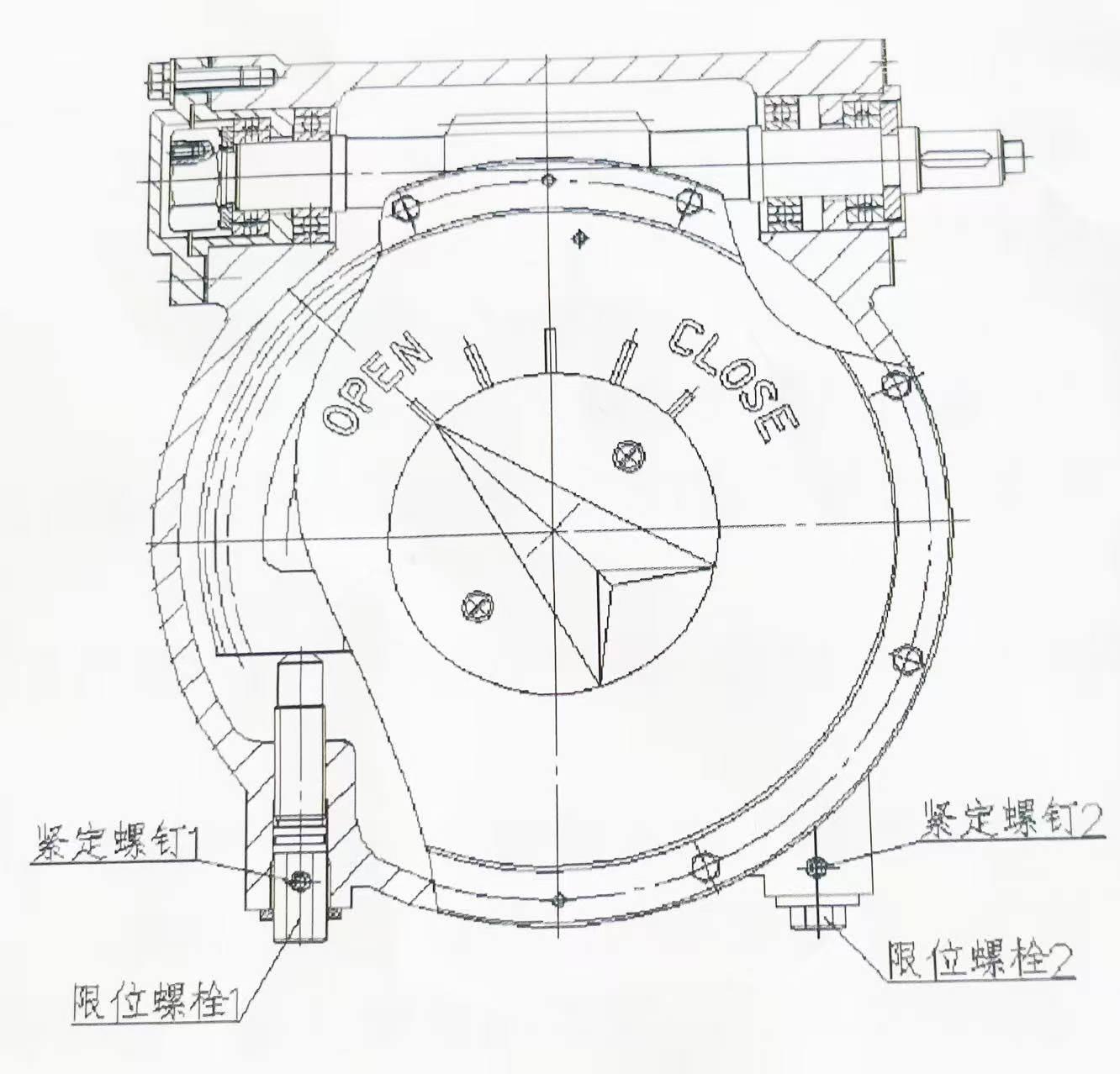 8. Adjusting Butterfly Valve Switching Position: If the butterfly disc seal surface does not close fully, use a hex wrench to loosen set screw 2 on the worm gear housing (see Figure 3). Then use an adjustable wrench to turn limit bolt 2 counterclockwise, taking care not to over-adjust. Similarly, if the butterfly disc does not open fully, use a hex wrench to loosen set screw 1. then use an adjustable wrench to turn stop bolt 1 counterclockwise until the disc is perpendicular to the sealing surface. Avoid over-opening.