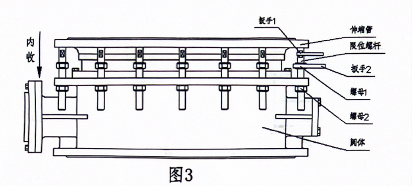 10. Disassembly: When removing the telescopic double-seal butterfly valve from the pipeline, first remove the bolts connecting the valve to the pipeline. Loosen nut 1, tighten nut 2, and retract the telescopic tube to disassemble.